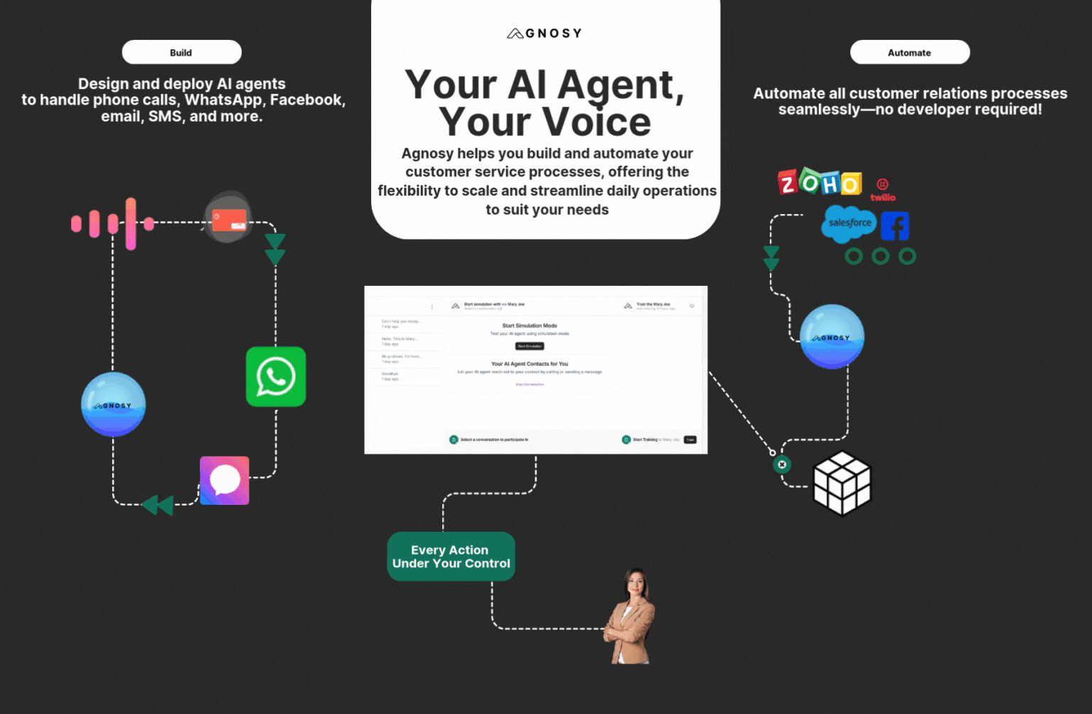 Agnosy helps businesses create and manage Customer experience and support AI agents to handle inbound and outbound voice and text interactions, connecting with clients, leads, and partners while simplifying processes.